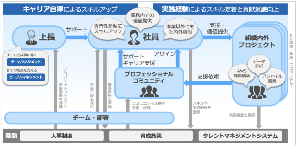 (自律的スキルアップに加え、プロジェクト/コミュニティでの実践による動的な学びで成長)