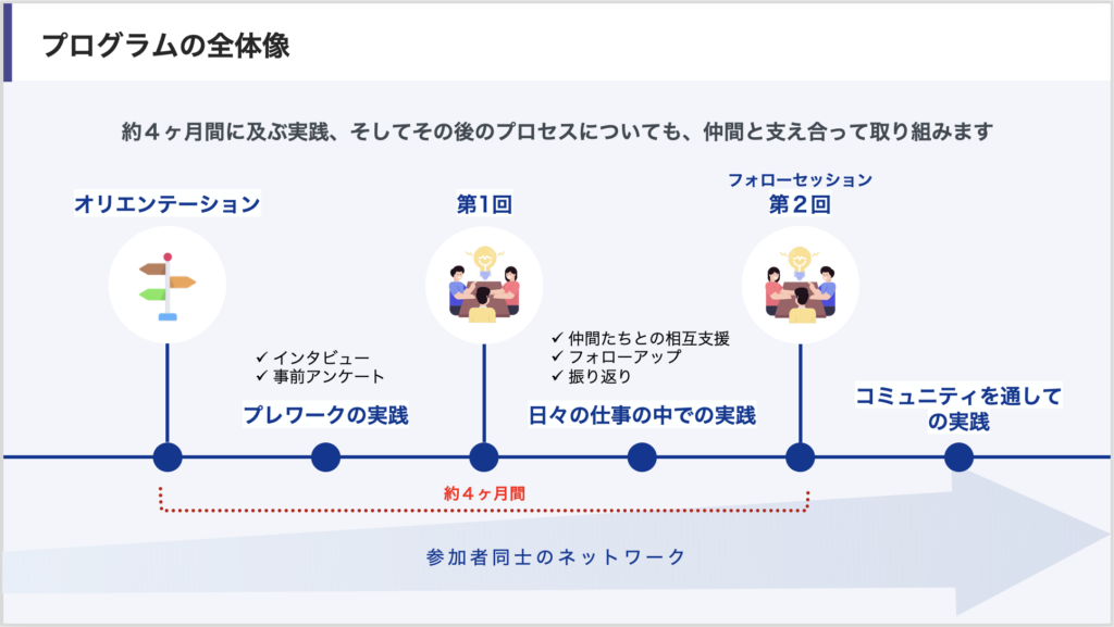このリーダーシップ・マネジメント研修のもう一つの特徴が、単発の研修で終わらせず、約4か月にわたるプロセスとして設計されている点にあります。