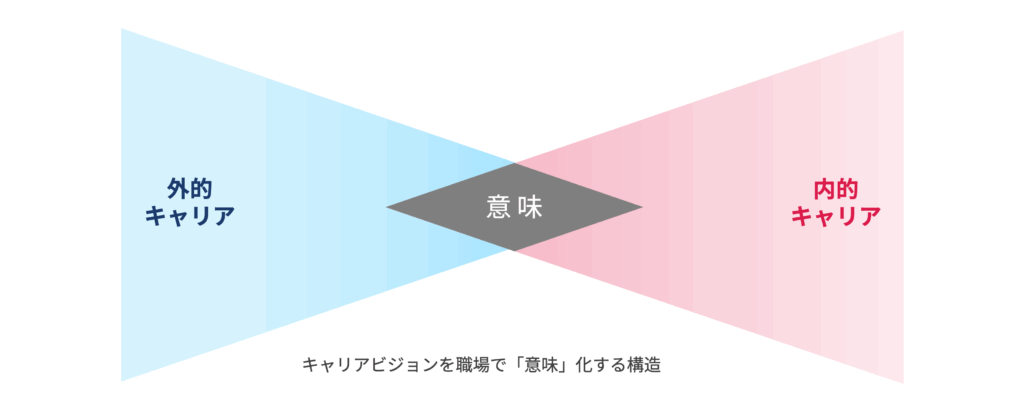 「自分は、◯◯のような仕事をしてみたい」「私は趣味を大切にしたい」といった、キャリアビジョンがあるが、現状の仕事・人生とありたい姿の乖離に直面した人がいたとします。そうした内的な想いを持つことは大切ですが、職場での仕事や役割は、顧客や組織への価値創出が起点にあります。「自組織にとって、自分自身の望むビジョンはどんな意味があるのか?」「そのライフを大切にしながら、仕事上ではどんなことを大切にしたいのか?」といった視点で外的基準にも意味づけられていなければ、内的な想いが具体的な仕事やキャリア形成につながりづらくなります。